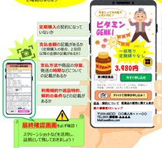 - 定期購入になっていないかなど、広告表示や購入画面の記載内容をよく確認しましょう。